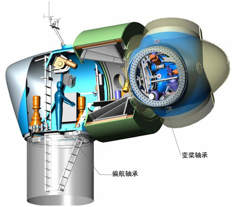 偏航回轉支承 偏航軸承用來轉動塔頂機艙,其齒圈通過螺栓與塔筒法蘭連接,無齒圈與機艙主機架連接,保持風機正向迎風、背離風向或者在電纜過度扭纜時解纜。